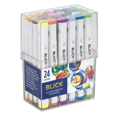 ![]() | Blick Studio Brush Markers and Sets - $63.57 This set includes Black Cool Gray 50% Bright Green Dark Green Leaf Green Apple Green Ink Blue Light Cerulean Blue True Blue Ultramarine Periwinkle Violet Red Very Berry Pink Brick Red Dark Umber Dark Brown Sienna Caramel Peach Orange Saffron and Canary Yellow in a box with a plastic tray. |
